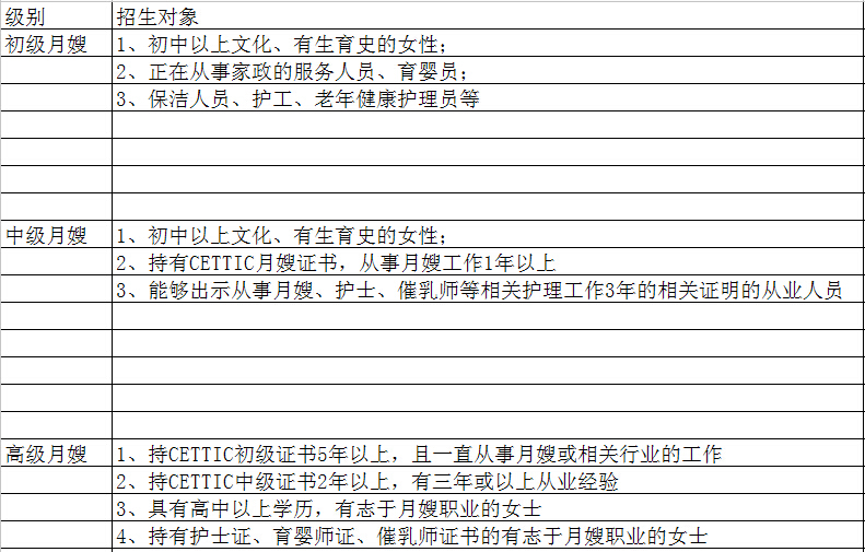| 初级月嫂 | 1、初中以上文化、有生育史的女性; |